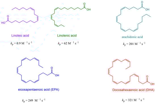 Common unsaturated fatty acids found in animal and vegetable food-grade oils and rate constants kp for the propagation step. Values of kp are taken from Pratt et al. [10].
