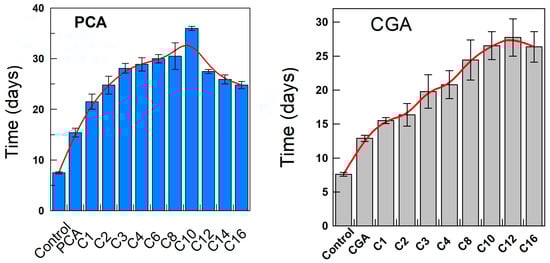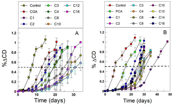 The relative AO efficiency of PCA and CGA esters in 4:6 (o/w) olive oil-in-water emulsions was investigated, as in previous works [13,61,62], by measuring the formation of the primary oxidation product, conjugated dienes (CDs). The relative efficiency was determined at T = 60 °C by measuring the time required to increase the CD content by 0.5% both in the absence (control experiment) and in the presence of AOs, measured after the propagation step had been initiated (dashed lines in Figure 2). The variation of the time with the length of the alkyl chain is shown in Figure 6 for PCA (7A) and CGA (7B), and the relative order is in keeping with that obtained by determining the induction times.