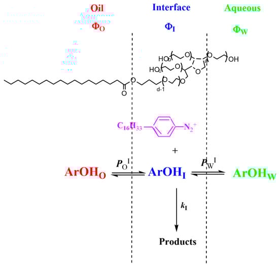 The chemical kinetic method exploits the overall bimolecular reaction between hydrophobic 4-hexadecylbenzenediazonium, 16-ArN2+ ions, and an AO (ArOH in the Figure 3). 16-ArN2+ is located completely in the interfacial region, but the distributions of the AOs depend on their relative solubilities in the oil, interfacial, and aqueous regions, Figure 3. Consequently, two partition constants, PWI and POI, are now necessary to describe the distribution of the antioxidant between the aqueous and interfacial regions PWI and between the oil and interfacial regions POI, Equations (12) and (13), respectively [28].