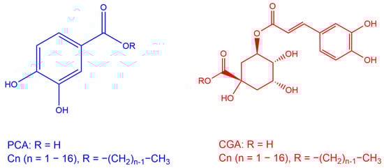 Chlorogenate and protocatechuate esters (C2–C4) were synthesized by chemical acylation of the carboxylic group or by enzymatic acylation (C6–C16 derivatives) following the procedures described elsewhere [55]. The chemical structures of the synthesized antioxidants are shown in Figure 4.