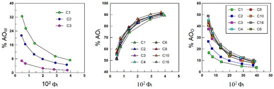 Results in Figure 8 show that the effective concentration of the AOs in the aqueous (Figure 8A,D) and in the oil (Figure 8C,F) regions is much smaller than the stoichiometric one at any surfactant concentration, but that in the interfacial region is 30–300 times higher. Results also show that, upon increasing the surfactant volume fraction, antioxidants are effectively diluted in all regions. This is a consequence of competitive factors that work in opposite directions, as shown in Equation (25). On one side, antioxidants are being transferred to the interfacial region upon increasing ΦI, and hence the number of moles of antioxidants in the aqueous and oil regions (i.e., their percentage) decreases, hence decreasing their effective concentration (moles per liter of the particular region), and concomitantly, the number of moles of AO in the interfacial region increases. However, the extent of this increase is not compensated by the extent of the increase in the interfacial volume as a consequence of increasing ΦI, so that the ratio %AOI/ΦI decreases upon increasing ΦI, and hence the antioxidants are effectively diluted as they occur (for different reasons) in the aqueous and oil regions.