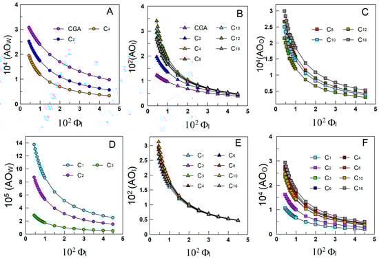 In attempting to obtain physical evidence on which region of the emulsion is mainly taking place the inhibition reaction and to acquire a better feeling on how the hydrophobicity of the antioxidant and the oil to water ratio (o/w) employed in the preparation of the emulsion affects the interfacial concentrations, we plotted, in the same graph, the variations of the effective concentrations ((AOW), (AOI), and (AOO)) at the low surfactant volume fraction employed (ΦI = 0.01) and the variation of the induction times τind against the number of C atoms in their alkyl chain, Figure 9A–F.