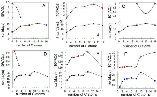 As shown, plots for the variations of τind and (AOI) parallel each other but not those between τind and (AOW) or (AOO). Because Equation (11) shows us that the rate of the inhibition reaction is the sum of those in the aqueous, interfacial, and oil regions, one would expect the concentration of lipid peroxides in the aqueous region, if any, to be negligible. Figure 8A,D also show that the concentration of antioxidants in the aqueous region is much lower than in the stoichiometric region and negligible for antioxidants with alkyl chains longer than 4 C atoms. Hence, the contribution of the rate in the aqueous region to the overall inhibition reaction rate should be negligible.