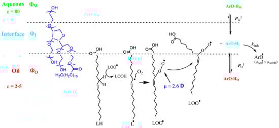 Thus, the results in Figure 9 suggest a scenario close to that depicted in Figure 10, where the following features are remarkable: (I) the time-average location of ground-state antioxidants of moderate hydrophobicity is the interfacial region, and (II) the dipole moment of a PUFA molecule and that of the corresponding radical LOO•, which makes it diffuse to the interfacial region, reacting with the antioxidants located there.