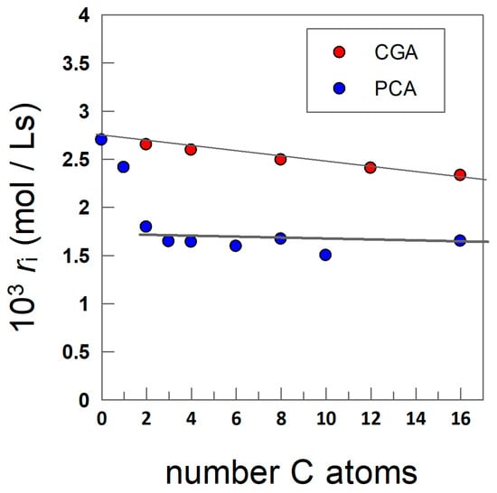 As observed, a maximum is obtained for the C6–C8 derivatives (PCA) and for the C10–C16 derivatives (CGA), indicating that their efficiency in inhibiting lipid oxidation does not correlate with the hydrophobicity of the antioxidants. This parabola-like variation of the efficiency with the number of C atoms in the alkyl chain is in keeping with the so-called “cut off” effect previously reported by ourselves [28,63] and others [64,65,66,67] for a series of homologous AOs bearing the same reactive moieties but of different hydrophobicity. Results in Figure 6 are also, qualitatively, similar to those reported by Laguerre et al. in Brij 35 stabilized sunflower oil-in water emulsions [64].