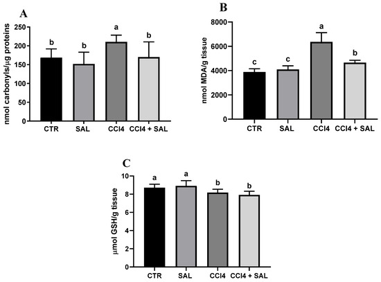 Protein carbonylation (A), malondialdehyde (MDA) (B), and GSH content (C) in the liver of all CTR, SAL, CCl4, and CCl4 + SAL rats, performing three replicates for each animal. Values are expressed as means ± SD (n = 10). Values within each row different letters (a,b,c) are significantly different with a one way ANOVA-test (p ≤ 0.05).