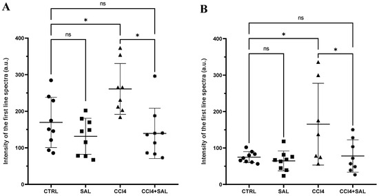 Free radical measurements through EPR spectroscopy in the liver (A) and brain (B) of all CTR (•), SAL (■), CCl4 (▲), and CCl4 + SAL (*) rats. The scattered dot plot represents total oxygen-, nitrogen-, and carbon-centered free radical species (arbitrary units). Values are expressed as means ± SD (panel A: CTR, SAL, CCl4 + SAL n = 9, CCl4 n = 8; panel B: CTR, SAL n = 9, CCl4 n = 7, CCl4 + SAL n = 8). *: values significantly different with a one-way ANOVA-test (p ≤ 0.05); ns: not significant.