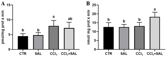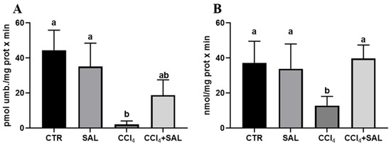 Ethoxycoumarin-O-deethylase, ECOD (A) and p-nitrophenol hydroxylase, pNPH (B) activities in liver of all CTR, SAL, CCl4, and CCl4 + SAL rats, performing three replicates for each animal. Values are expressed as means ± SD (n = 10) and reported as pmol umbelliferone/(mg protein × min) for ECOD and as nmol/(mg protein × min) for pNPH. a, b: values significantly different with a one-way ANOVA-test (p ≤ 0.05).