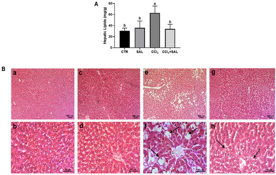 Total hepatic lipid content (A) measured in liver tissue from all CTR, SAL, CCl4, and CCl4 + SAL rats, performing three replicates for each animal. Values are expressed as means ± SD (n = 10). a, b: values significantly different with a one-way ANOVA-test (p ≤ 0.05). Hematoxylin and eosin (H&O) staining (B) of liver tissue from CTR (a,b), SAL (c,d), CCl4 (e,f), and CCl4 + SAL (g,h) rats. Arrows indicate lipids ballooning (f) or a decrease in steatosis (h). Magnification: (a,c,e,g), bar = 100 µm; (b,d,f,h), bar = 50 µm.