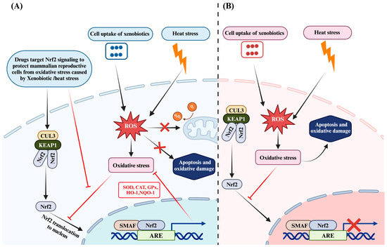 Overall, this review provides compelling evidence that the Nrf2 signaling pathway plays a crucial role in safeguarding mammalian reproductive cells from oxidative stress and apoptosis induced by heat stress and xenobiotic exposure. Through the activation of antioxidant defense genes, the Nrf2 signaling pathway mitigates the harmful effects of heat stress and xenobiotic-induced oxidative stress and apoptosis, thereby preserving the functionality and viability of reproductive cells. Furthermore, the review highlights the pivotal bioactive compounds capable of alleviating oxidative distress caused by heat stress and xenobiotics, safeguarding mammalian reproductive cells from oxidative damage through the activation of the Nrf2 signaling pathway. These findings underscore the importance of Nrf2 in maintaining cellular homeostasis under environmental stressors, highlighting its potential as a therapeutic target for enhancing reproductive health. The intricate regulation of Nrf2 through its interaction with Keap1 and subsequent activation in response to oxidative stress illustrates a sophisticated cellular mechanism for combating cellular damage and maintaining reproductive integrity. Future studies should explore the development of targeted therapies that enhance the Nrf2 signaling pathway, offering new avenues for protecting reproductive health against environmental stressors. Additionally, investigating the long-term effects of Nrf2 modulation on reproductive function could provide deeper insights into its therapeutic potential.