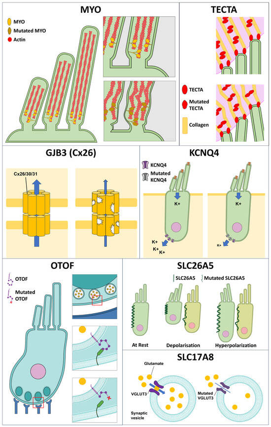 | MYO | Myosin, class II and III | DFNA4/11/22/48, DFNB3/30/37 | NS and S | Development and function of the cochlea duct (class II) and stereocilia of the vestibular hair cells (class III) [132,133]. | Myosin are differentially expressed under oxidative stress in diabetic rat brains [134]. |