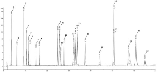 The chromatographic and spectrophotometric analysis of the standard polyphenolic mixture. The overlaid chromatograms were registered at λ = 280 nm; λ = 320 nm; λ = 370 nm; λ = 360 nm; λ = 250 nm; 1 = gallic acid; 2 = protocatechuic acid; 3 = (+)-catechin; 4 = chlorogenic acid; 5 = caffeic acid; 6 = (−)-epicatechin; 7 = p-coumaric acid; 8 = ferulic acid; 9 = hyperoside; 10 = isoquercitrin; 11 = (+)-rutin trihydrate; 12 = phloridzin; 13 = trans-cinnamic acid; 14 = quercitrin; 15 = myricetin; 16 = daidzein; 17 = naringenin; 18 = hesperetin; 19 = genistein; 20 = naringenin chalcone; 21 = kaempferol; 22 = apigenin. The retention time for each compound, the concentrations applied for the chromatographic analysis of the mixture, and the λmax are reported in Table S2.