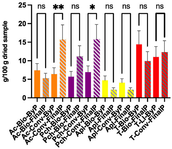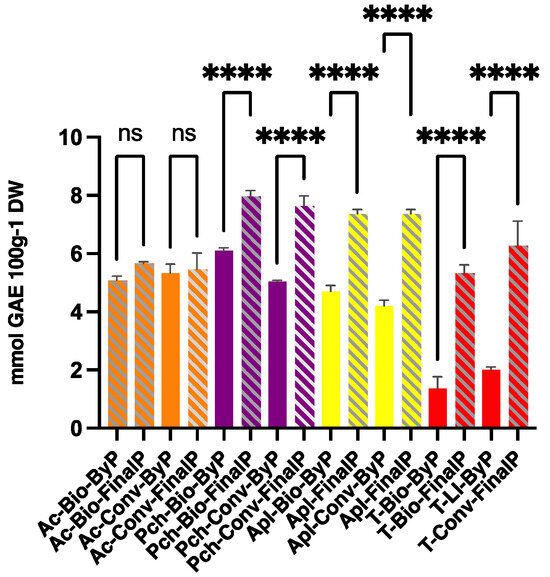 Figure 5 shows the TAS values for all the samples obtained following the methodology described in Section 2.8. Overall, the results showed that final products display a similar TAS value compared to that of the by-products, except for Pch-Bio-Ps. This is an interesting result since the TPC levels evaluated for both the ByPs and FinalPs were found to be significatively different for all the fruit samples except for apricot products.
