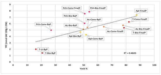 The analysis of the graph reported in Figure 6, in which TPC and TAS values are correlated, indicates that a higher content of phenolic compounds might not be necessarily related to a higher antioxidant activity. This aspect confirms the importance of characterizing the bioactive compounds since the type and the nature of the polyphenol contained in the sample might influence the TAS values greatly. Other important considerations that can help in considering by-products for their valorization have to be conducted on the results obtained by correlating the TPC values to the extract yield (%) (Figure 7). According to the results previously discussed, a higher yield of extraction does not necessarily relate to a proportional increase in the content of phenolic compounds. This observation is more evident for the peach and apricot samples studied, whereas for apple and tomato samples, a higher correlation is visible between by-products and final products.