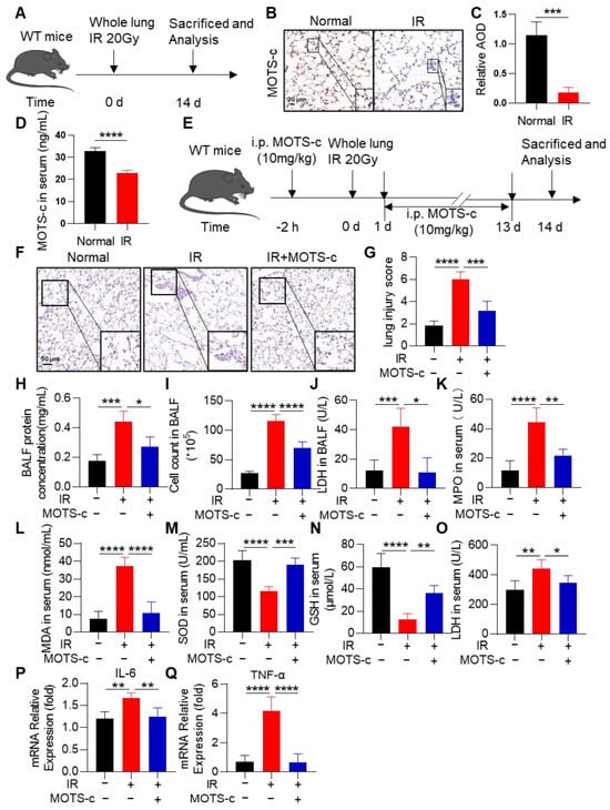 MOTS-c alleviated the oxidant damage, inflammation, and lung tissue injury in irradiated mice. (A) The schematic timeline of radiation-induced RP in WT mice. (B,C) Immunohistochemical staining was used to detect the expression of MOTS-c in lung tissue, scale bar = 20 μm. (D) ELISA was used to detect the expression of MOTS-c in serum. (E) Schematic timeline of MOTS-c intervention for radiation-induced RP in WT mice. Mice were anesthetized with pentobarbital sodium (40 mg/kg) and administered a dose of 20 Gy irradiation. After X-ray irradiation, mice in the MOTS-c intervention group received intraperitoneal injections of 10 mg/kg MOTS-c peptide dissolved in ddH2O daily for 14 days. (F) Lung tissue sections were stained with hematoxylin-eosin (HE), scale bar = 50 μm. (G) The lung injury score was calculated by histological analysis in different groups. (H,I) Total protein and cells in the BALF were detected. (J) LDH in the BALF was determined. (K–O) MPO, MDA, SOD, GSH, and LDH in mouse serum were determined. (P,Q) mRNA levels of IL-6 and TNF-α were measured by quantitative real-time PCR. n = 5, * p < 0.05, ** p < 0.01, *** p < 0.001, **** p < 0.0001. IR: irradiation.