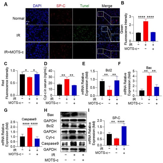 MOTS-c prevented the apoptosis of alveolar epithelial cells in RP mice. (A–C) Lung tissues were stained with the tunnel (green), SP-C (red), and DAPI (blue) for immunofluorescence analysis, scale bar = 20 μm. (D) ELISA was used to detect the expression of Cyt-c in serum. (E–G) mRNA levels of Bcl2, Bax, and Caspase9 were measured by quantitative real-time PCR. (H) Protein levels of Cyt-c, Bcl2, Bax, and Caspase9 in lung tissues were assayed by western blotting. (I) mRNA level of SP-C was measured by quantitative real-time PCR. n = 5, * p < 0.05, ** p < 0.01, **** p < 0.0001. IR: irradiation.