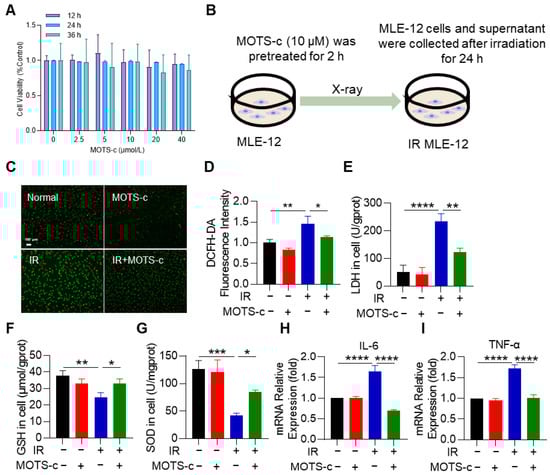 MOTS-c alleviates radiation-induced oxidative stress and inflammation in MLE-12 cells. (A) CCK8 assay was performed to detect the toxicity of MOTS-c to MLE-12. (B) Irradiation scheme for MLE-12 cells. (C,D) DCFH-DA fluorescent probes were used to detect the intracellular ROS, scale bar = 100 μm. (E–G) LDH, GSH, and SOD in MLE-12 were determined. (H,I) mRNA levels of IL-6 and TNF-α were measured by qRT-PCR. n = 3, * p < 0.05, ** p < 0.01, *** p < 0.001, **** p < 0.0001. IR: irradiation.