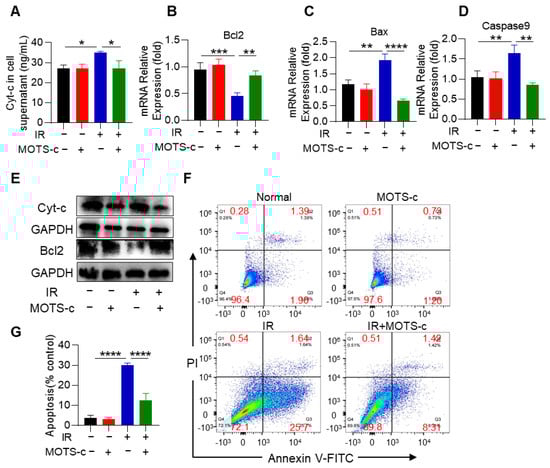 ELISA analysis demonstrated that MOTS-c significantly decreased Cyt-c levels in cell supernatant (Figure 4A). MOTS-c also significantly downregulated the mRNA expression of the pro-apoptotic genes Bax and Caspase9, while upregulating the anti-apoptotic gene Bcl2 (Figure 4B–D). Moreover, MOTS-c treatment decreased the protein content of pro-apoptotic genes Cyt-c, while increasing the anti-apoptotic gene Bcl2 (Figure 4E). Flow cytometry also showed that MOTS-c significantly inhibited radiation-induced apoptosis in MLE-12 cells (Figure 4F,G).