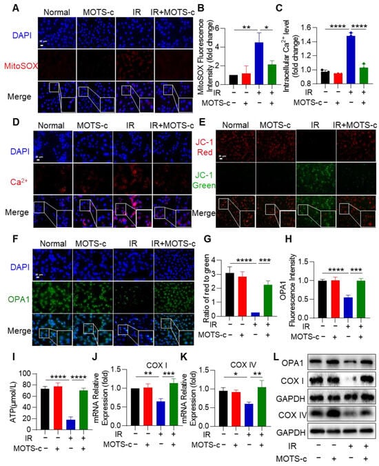 MOTS-c relieved radiation-induced mitochondrial damage in MLE-12 cells. (A,B) MitoSOX Red fluorescent probe (5 μM) was used to detect mitochondrial reactive oxygen species in MLE-12, scale bar = 20 μm. (C,D) Rhod-2, AM Red fluorescent probe (4 μM) was used to detect calcium content in MLE-12, scale bar = 20 μm. (E,G) Mitochondrial membrane potential of MLE-12 was detected by JC-1 staining kit, scale bar = 20 μm. (F,H) MLE-12 were stained with the OPA1 (green) and DAPI (blue) for immunofluorescence analysis, scale bar = 20 μm. (I) The content of ATP in MLE-12 was detected by the ATP detection kit. (J,K) mRNA levels of COX I and COX IV were measured by quantitative PCR. (L) Protein levels of COX I, COX IV, and OPA1 in MLE-12 were assayed by western blotting. n = 3, * p < 0.05, ** p < 0.01, *** p < 0.001, **** p < 0.0001. IR: irradiation.