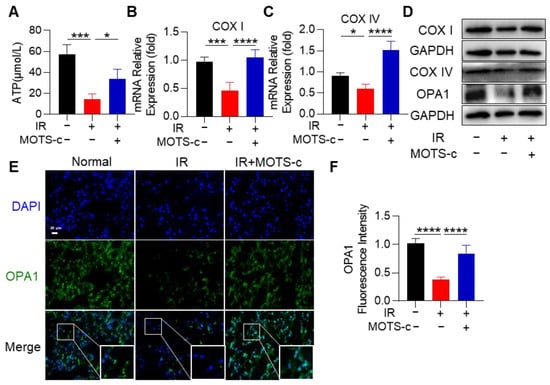 MOTS-c mitigated mitochondrial injury in RP mice. (A) ATP detection kit was used to detect the content of ATP in lung tissue. (B,C) mRNA levels of COX I and COX IV were measured by quantitative real-time PCR in lung tissue. (D) The expression of OPA1, COX I, and COX IV were determined using the western blot. (E,F) Lung tissues were stained with the OPA1 (green) and DAPI (blue) for immunofluorescence analysis, scale bar = 20 μm. n = 5, * p < 0.05, *** p < 0.001, **** p < 0.0001. IR: irradiation.