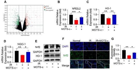 MOTS-c increased Nrf2 content and induced its nucleus translocation in RP mice. (A) The volcano map showed that the expression of Nrf2 in mice was decreased after irradiation. (B–D) The mRNA levels of NFE2L2, HO-1, and NQO1 were measured by quantitative real-time PCR in lung tissue. (E) The expression of Nrf2, and HO-1 were determined using the western blot. (F,G) Lung tissues were stained with the Nrf2 (green) and DAPI (blue) for immunofluorescence analysis, scale bar = 20 μm. n = 5, * p < 0.05, ** p < 0.01, *** p < 0.001. IR: irradiation.