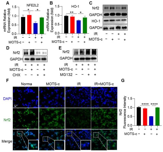 MOTS-c promoted Nrf2 synthesis and translocation to the nucleus. (A,B) mRNA levels of NFE2L2 and HO-1 were measured by quantitative real-time PCR in MLE-12. (C) Protein levels of Nrf2 and HO-1 in MLE-12 were assayed by western blotting. (D,E) MLE-12 was pretreated with 10 μM MOTS-c for 2 h following radiation 24 h, then treated with CHX (25 μM) or MG132 (20 μM). The expression of Nrf2 was determined using the western blot. (F,G) MLE-12 cells were stained with the Nrf2 (green) and DAPI (blue) for immunofluorescence analysis, scale bar = 20 μm. n = 3, * p < 0.05, ** p < 0.01, **** p < 0.0001. IR: irradiation.