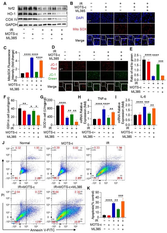 Inhibition of Nrf2 abolished the protective function of MOTS-c in MLE-12 cells. (A) To further evaluate whether MOTS-c plays a protective role through Nrf2, cells were pretreated with Nrf2 inhibitor ML385. The expression of Nrf2, HO-1, and COX IV was determined using the western blot. (B,C) MitoSOX Red fluorescent probe (5 μM) was used to detect mitochondrial reactive oxygen species in MLE-12, scale bar = 20 μm. (D,E) Mitochondrial membrane potential of MLE-12 was detected by JC-1 staining kit, scale bar = 20 μm. (F,G) GSH and SOD in MLE-12 were determined. (H,I) The mRNA levels of IL-6 and TNF-α in MLE-12 were measured by quantitative real-time PCR. (J,K) The apoptosis of MLE-12 was measured by flow cytometry. n = 3, * p < 0.05, ** p < 0.01, *** p < 0.001, **** p < 0.0001. IR: irradiation.