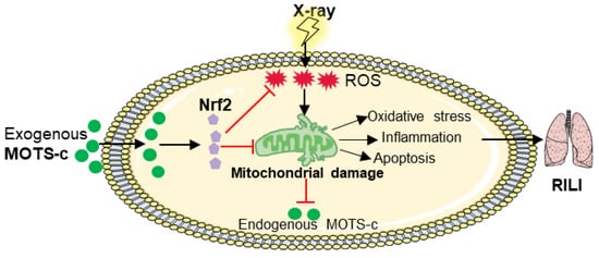 Radiation therapy often results in damage to normal lung tissue, presenting a significant challenge to its efficacy. It is crucial to find ways to mitigate or prevent adverse effects on the lungs caused by radiation therapy [31,32]. Our study shows that radiation induces the overproduction of ROS, leading to mitochondrial damage in a mouse model of RP. However, administration of MOTS-c, a mitochondria-derived peptide, can alleviate this detrimental effect. Additionally, MOTS-c protects against pulmonary inflammation, oxidative stress, and epithelial cell apoptosis in RP by preserving mitochondrial function. Through mechanistic investigations, we have determined that MOTS-c exerts its protective effects by activating the Nrf2 signaling pathway. Overall, our results suggest that MOTS-c mitigates RP by improving mitochondrial function through an Nrf2-dependent mechanism.