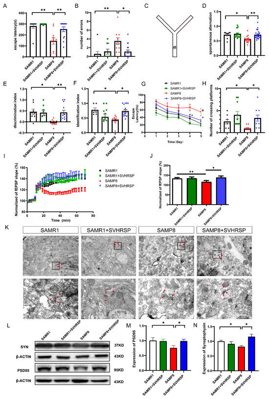 SVHRSP reduced memory impairment and improved synaptic functions. (A–H) The effects of SVHRSP on behavioral testing. (A) The escape latency of the passive avoidance experiment; (B) the number of mice that entered the dark room in the passive avoidance test; (C) a device structure-style diagram of the Y Maze; (D) the percentage of spontaneous alternate behavior in the Y-maze trial; (E) the discrimination index of each group of mice in the NOR test; (F) the identification index of each group of mice in the NOR test; (G) the escape latency to reach the platform in the MWM training phase; (H) the number of mice crossing the platform in the MWM probe trials; (I,J) The effects of SVHRSP on long-term potentiation including slope change and amplitude change; (K) The effects of SVHRSP on the synaptic ultrastructure in the hippocampus; The red arrows indicate the presence of synaptic vesicles and postsynaptic dense bodies. (L–N) the representative Western blot bands and the quantification of relative protein expression for SYN and PSD95. The bars represent the mean ± SD. * p < 0.05, ** p < 0.01, # p < 0.05, versus the indicated groups.