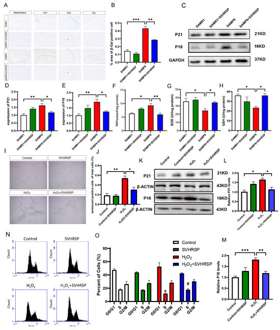 SVHRSP downregulated the expression of aging markers. (A,B) Representative SA-β-gal staining images and quantitative analysis in SAMP8 mice. (C) Representative WB bands. (D,E) Quantitative analysis of P21 and P16 in vivo. (F–H) Quantitative analysis of GSH-PX, SOD, and MDA enzyme activity in vivo. (I,J) Representative SA-β-gal staining images and quantitative analysis in H2O2-induced SH-SY5Y cells. (K) Representative WB bands. (L,M) Quantitative analysis of P21 and p1 in vitro. (N,O) Quantitative analysis of cell cycle arrest in the G0/G1 phase. The cell fraction in the G0/G1 phase, G2/M phase, and S phase was calculated. The bars represent the mean ± SD. * p < 0.05, ** p < 0.01, *** p < 0.001, # p < 0.05, versus the indicated groups (n = 3 for each group).