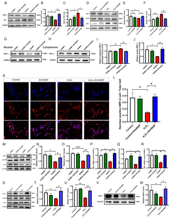 SVHRSP can inhibit the SIRT1/P53 signaling pathway, leading to enhanced nuclear translocation of NRF-2 and subsequently promoting the expression of antioxidants in SAMP8 mice. (A) Representative WB bands. (B,C) Quantitative analysis of SIRT1 and P53 in vivo. (D) Representative WB bands. (E,F) Quantitative analysis of SIRT1 and P53 in vitro. (G–J) Representative WB bands and quantification analysis of nuclear NRF2 and cytoplasmic NRF2. (K,L) Immunofluorescence images and quantification analysis of NRF2 cells/total cells (scale bar = 10 μm). (M) Representative WB bands. (N,O) Quantitative analysis of SOD 1 and HO-1 in vivo. (P–R) mRNA quantitative analysis of SOD 1, Hmox-1, and NQO1 in vivo. (S–W) Representative WB bands and quantitative analysis of SOD 1, HO-1, and NQO 1 in vitro. The bars represent the mean ± SD. ns = not significant, * p < 0.05, ** p < 0.01, *** p < 0.001 versus the indicated groups (n = 3 for each group).