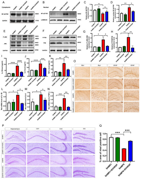 SVHRSP exerts inhibitory effects on neuroinflammation in SAMP8 mice by modulating the MAPKs/NF-κB signaling pathway. (A–D) Representative Western blot bands and quantitative analysis of cytoplasmic NF-κB p65 and nuclear NF-κB p65. (E–H) Representative Western blot bands and quantification analysis of p-JNK, JNK, p-P38, and P38. (I–K) Quantitative analysis of the serum level of IL-1B, IL-6, and TNF-α measured by using ELISA. (L–N) Quantitative analysis of the mRNA level of IL-1B, IL-6, and TNF-α measured by using QRT-PCR. (O) Representative immunohistochemical images of Iba-1 (left) and GFAP (right). (P,Q) Representative image and quantitative analysis of Nissl staining. The bars represent the mean ± SD. ns = not significant, * p < 0.05, ** p < 0.01, *** p < 0.001, **** p < 0.0001 versus the indicated groups. Scale bar = 50 μm (n = 3 for each group).