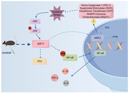 The regulation of oxidative stress is influenced by multiple factors, among which NRF2 plays a crucial role as a transcription factor in this process. Under normal physiological conditions, NRF2 activity is suppressed and remains localized in the cytoplasm. However, upon the occurrence of oxidative stress, NRF2 can initiate a cascade of antioxidant and detoxification genes to safeguard the organism against the deleterious effects of reactive oxygen species (ROS) [44,45]. The cyclin-dependent kinase (CDK) inhibitor P21 plays a crucial physiological role in the regulation of NRF2 expression. Multiple studies have demonstrated that P21 can interact with NRF2 and disrupt its binding to Keap1, thereby impeding the degradation of NRF2 [46,47]. Additionally, NRF2-mediated oxidative stress also contributes to cell cycle regulation by inactivating the P16/pRb signaling pathway [48]. In addition to that, NRF2 has close associations with aging. Studies have reported that the downregulation of NRF2 in the hippocampus of SAMP8 mice triggers oxidative stress and neuroinflammation, thereby resulting in cognitive dysfunction [44,45]. Activation of the NRF2 signaling pathway has been shown to ameliorate AD-related pathological characteristics in SAMP8 mice [44,45]. Therefore, we investigated whether SVHRSP could induce the nuclear translocation of the NRF2 transcription factor in the brains of SAMP8 mice by using karyoplasmic separation techniques. Our results demonstrate an increase in nuclear protein levels of NRF2 in the SAMP8 plus SVHRSP group, while cytoplasmic protein levels remained unchanged. Consistent findings were observed through cellular immunofluorescence analysis for H₂O₂-induced cells regarding the nuclear translocation of NRF2. In conclusion, SVHRSP can mitigate age-related oxidative stress by promoting the nuclear translocation of NRF2. To further validate the role played by NRF2 in SVHRSP’s anti-aging effects, we assessed the expression levels of downstream antioxidant proteins regulated by this transcription factor including SOD1, NQO1, and HO-1. The Western blot results clearly demonstrate that SVHRSP effectively enhanced the expression of SOD1 and HO-1 proteins in the brain of SAMP8 mice. Concurrently, the findings from the in vitro cell experiments were consistent with those obtained in vivo, as SVHRSP significantly upregulated the expression of SOD1, NQO1, and HO-1 proteins in an H2O2-induced cellular model. These results provide evidence that SVHRSP facilitates NRF2 activation, promotes downstream antioxidant protein expression, and mitigates oxidative damage during aging. The present findings suggest that the protective effect of SVHRSP in aging may be achieved through activation of the SIRT1-P53 signaling pathway. The deacetylation of PPARγ coactivator-1α (PGC-1α) can be facilitated by SIRT1, thereby promoting the subsequent upregulation of NRF2 and antioxidation-related genes [31,32]. Furthermore, we hypothesized that SVHRSP activates the SIRT1-P53 signaling pathway and regulates the activation of the NRF2 transcription factor to provide protection against oxidative stress and delay the aging process.
