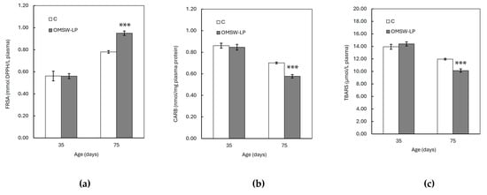 Effect of diet on plasma (a) total antioxidant capacity (TAC), (b) carbonyl (CARB) concentration, and (c) thiobarbituricacidreactive species (TBARS) concentration of piglets at 35 and 75 days of age (mean ± standard error of means). C, control (C) diet with no additions; OMSW-LP, diet with 50 g of solid-state-fermented mixture of 80% olive mill stone waste (OMSW) and 20% Lathyrus clymenum pericarps (LP) added per kg. Vertical lines represent the standard error of means. ***, statistically significant difference between diets (p < 0.001; two-tailed significance of the t-test).