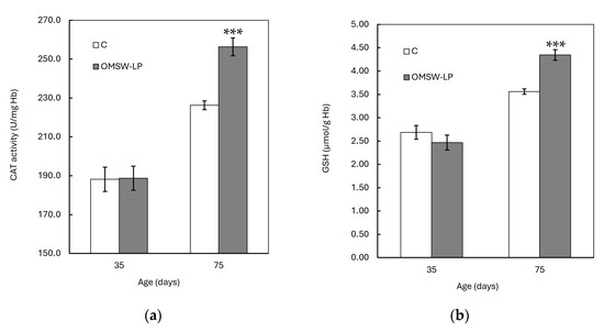 The FRSA, CAT activity, and GSH concentration were increased (p < 0.001), whereas the CARB and TBARS concentrations were found to be decreased (p < 0.001) with age in both dietary treatments. However, these age effects were different between the C and OMSW-LP-fed piglets, as indicated by the significant diet by age interactions (p = 0.004, p = 0.004 and p < 0.001, p < 0.001 and p < 0.001 for FRSA, CAT activity, GSH concentration, CARB content and TBARS concentration, respectively; Table S1). To understand these interactions, the means of the oxidative biomarkers in the two dietary treatments were plotted against age (Figure 1 and Figure 2). It was observed that from 35 to 75 days of age, the FRSA (Figure 1a), CAT activity (Figure 2a), and GSH concentration (Figure 2b) increased in both groups, but the increase in the OMSW-LP group was much higher compared to that in the C-fed piglets (69% vs. 39%, 36% vs. 20%, and 76% vs. 33% for FRSA, CAT activity, and GSH concentration, respectively). It was also noted that the CARB (Figure 1b) and TBARS concentrations (Figure 1c) decreased in both groups with age, but both biomarkers exhibited a much more pronounced reduction in the OMSW-LP piglets compared to the C piglets (32% vs. 19% and 30% vs. 14% for CARB content and TBRAS concentrations, respectively).