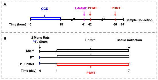 Dulbecco’s modified eagle medium/F12 (DMEM/F12, 11320033, Gibco, Waltham, MA, USA) supplemented with 10% fetal bovine serum (FBS, 6000044, Gibco, USA) and 1% penicillin–streptomycin (15070063, Gibco, USA) was used to culture the mouse brain endothelial cell line, bEnd.3. The medium was changed every two days. Cells were seeded on a 6-well plate or 24-well plate at a density of 5 × 104 cells/cm2. Sterile glass slides were placed in 24-well cell culture plates. The cells were washed twice with PBS, and the medium was replaced with either glucose-free DMEM (11966025, Gibco, USA) for OGD, which represents a common in vitro model of ischemic stroke used extensively in basic and preclinical stroke research [22,23], or DMEM/F12 (11320033, Gibco, USA) for control treatments, respectively. The cell plates in the OGD group were transferred to a hypoxia chamber (Billups-Rothenberg Inc., San Diego, CA, USA), and the air was replaced with OGD gas (95% N2 and 5% CO2). Cells were exposed to OGD conditions for 18 h at 37 °C [24]. For the mechanism of eNOS studies, bEnd.3 cells were pretreated with 400 μM NOS inhibitor L-NG-Nitro arginine methyl ester (L-NAME, 483125-M, Sigma, USA) [20] for 60 min before PBMT.
