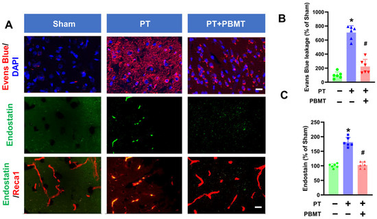 PBMT diminished the blood–brain barrier (BBB) permeability and decreased endostatin levels in PTstroke rats. (A) Representative fluorescence images of Evans blue (red), endostatin (green), and Reca1 (red) in the peri-infarct zone. Nuclei were counterstained with DAPI (blue). (B,C) Quantitative analysis of Evans blue leakage and vessel-associated endostatin was performed using ImageJ software (n = 5–6). The data were expressed as percentage changes versus the respective sham group. * indicates p < 0.05 vs. sham group; # indicates p < 0.05 vs. PT-stroke group. Scale bar = 20 μm.