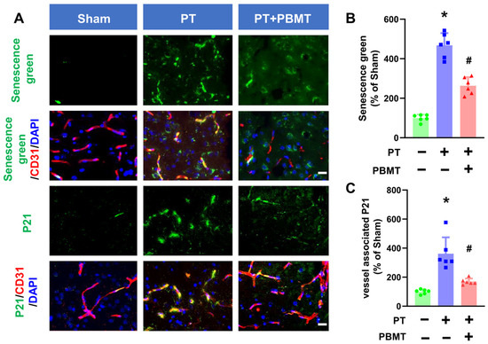PBMT inhibited cerebrovascular senescence in PT-stroke rats. (A) Representative fluorescence images of senescence green (green), P21 (green), and CD31 (red) in the peri-infarct zone. Nuclei were counterstained with DAPI (blue). (B,C) Quantitative analysis of vessel-associated senescence green and P21 in the peri-infarct zone of rats. The data were expressed as percentage changes versus the respective Sham group. * indicates p < 0.05 vs. sham group; # indicates p < 0.05 vs. PT-stroke group. Scale bar = 20 μm.