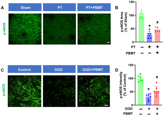 PBMT increased the phosphorylation of eNOS at Ser-1177 in PT-stroke rats and OGD-exposed bEnd.3 cells. (A) Representative fluorescence images of p-eNOS (green) in the peri-infarct zone. (B) Quantitative analysis of p-eNOS fluorescence intensity in the peri-infarct zone of rats. The data were expressed as percentage changes versus the respective sham group. Scale bar = 50 μm. (C) Representative immunofluorescence images for p-eNOS (green). (D) p-eNOS intensity was calculated and expressed as percentage changes relative to the control group. Scale bar = 50 µm (n = 6). * indicates p < 0.05 vs. sham or control group; # indicates p < 0.05 vs. PT-stroke or OGD group.