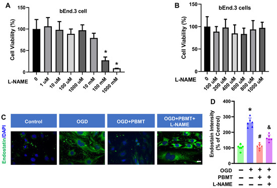 Effect of L-NAME on the cell viability and endostatin level in bEnd.3 cells. (A,B) MTT assay was used to measure viability in bEnd.3 cells after treatment with L-NAME at 1 μM to 1000 mM concentrations in bEnd.3 cells. The data are expressed as mean ± SD (n = 5–6). (C) Representative fluorescence images of endostatin (green) in the bEnd.3 cells. (D) Quantitative analysis of endostatin intensity. The data were expressed as percentage changes versus the respective control group. (n = 5–6). * indicates p < 0.05 vs. control group; # indicates p < 0.05 vs. OGD group. & indicates p < 0.05 vs. OGD + PBMT group. Scale bar = 20 μm.