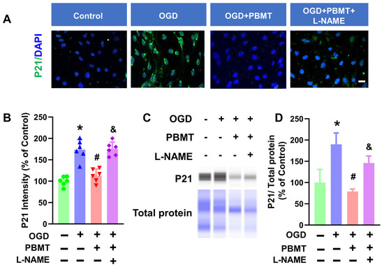 Pretreatment with L-NAME prevented PBMT-inhibited cellular senescence in bEnd.3 cells. (A) Representative fluorescence images of P21 (green) in the bEnd.3 cells. Nuclei were counterstained with DAPI (blue). (B) P21 staining intensity was analyzed and expressed as percentage changes versus the control group. (C,D) Western blotting and quantitative analysis of P21 levels using protein samples from bEnd.3 cells (n = 3–6). * indicates p < 0.05 vs. control group; # indicates p < 0.05 vs. OGD group. & indicates p < 0.05 vs. OGD + PBMT group. Scale bar = 20 μm.