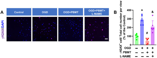Pretreatment with L-NAME prevented a PBMT-induced decrease in histone H2AX phosphorylation in bEnd.3 cells. (A) Representative immunofluorescence images for γH2AX (purple). Nuclei were counterstained with DAPI (blue). (B) The ratio of γH2AX+ cell and total cell numbers was calculated and expressed as percentage changes relative to the control group. Scale bar = 50 µm (n = 6). * indicates p < 0.05 vs. control group; # indicates p < 0.05 vs. OGD group. & indicates p < 0.05 vs. OGD + PBMT group.