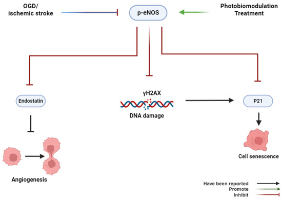 We were aware that L-NAME can inhibit inducible nitric oxide synthase (iNOS) in ECs. Nevertheless, L-NAME inhibits the proliferation and differentiation of ECs [49,50], which is contradictory to iNOS’s pro-angiogenic effect in this study. In addition, the specificity of L-NAME for inhibition of eNOS over other related NOS (e.g., iNOS) is higher than 10-fold [51]. In fact, L-NAME has been widely employed to inhibit eNOS activity in various cellular studies [52,53,54]. Although it has been reported that iNOS expression and cellular death can be observed in endothelial cells (ECs) 4 h after OGD [55], iNOS levels return to normal levels 25 h after OGD [51,56]. We discovered in the present study that endostatin levels were increased by L-NAME at 48 h following OGD, suggesting that L-NAME modulates endostatin in an iNOS-independent manner. DNA damage is prevalent following stroke, which leads to eNOS uncoupling. Instead of NO, uncoupled eNOS produces a superoxide anion serving as a harmful free radical to exacerbate oxidative stress and DNA damage [44,57]. We are the first to report that PBMT at a dose of 3 J/cm2 reduced DNA damage levels, evidenced by diminished γ-H2AX expression in endothelial cells.