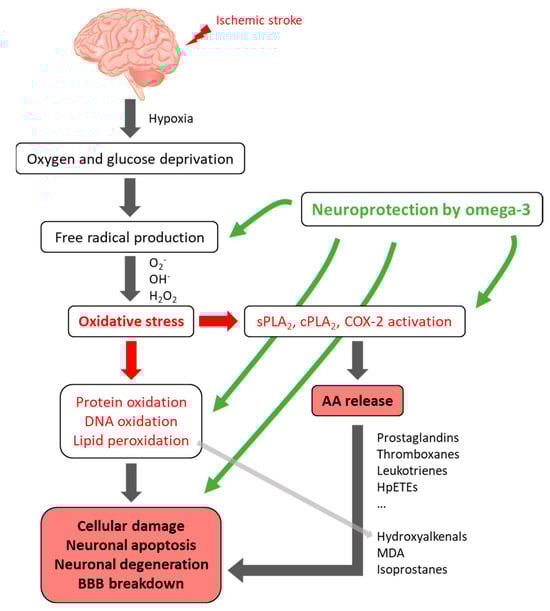 The high level of lipids in the brain delineates their critical role in preserving neuronal function and synaptic plasticity. Among them, PUFAs are known to optimize synaptic membrane organization and function, rendering neurons more resistant to neurodegenerative processes. PUFA brain content varies between 25 and 30% and is composed mainly of DHA (12–14% of total fatty acids) and AA (8–10% of total fatty acids) [111,112], both being critical for brain function and contributing to the prevention of age-related neurodegeneration and cognitive deficits [113,114,115]. Omega-3 PUFAs play a key role in stroke neuroprotection. A high EPA/AA ratio was associated with good outcomes in ischemic stroke, suggesting that pre-stroke nutrition habits influence the severity of ischemic stroke in patients [116]. Low DHA level was also shown to be a potential factor affecting the risk of depression in stroke patients [117]. The protective effects of omega-3 PUFAs against damage in stroke patients have been shown to involve multiple pathways. The administration of DHA conferred high-grade neuroprotection in an MCA occlusion model [118,119]. The protective effects of omega-3 PUFAs against damage in stroke patients have been shown to involve multiple pathways. DHA reduces oxidative stress (F4-NPs and 8-iso-PGF2) following hypoxia–ischemia in the urine of piglets [120]. Post-stroke DHA injection efficiently reduced brain infarct and ameliorated neurological deficits 3 days after transient MCA occlusion, inhibiting the infiltration of immune cells and promoting the polarization of macrophages toward an anti-inflammatory M2 phenotype, therefore reducing central and peripheral inflammation after stroke [121]. DHA can reduce oxidative stress and cerebral ischemia–reperfusion injury by reducing COX-2 expression [122]. In rat brain microvascular endothelial cells under an oxygen- and glucose-deprivation environment (OGD), that mimics ischemic stroke in vitro, DHA was shown to decrease apoptosis, COX-2 protein expression, and the secretion of PGE2, PGI2, vascular endothelial growth factor (VEGF), and angiopoietin-2 (Ang-2, which has been shown to cause blood–brain barrier damage and to increase endothelial cell apoptosis) [123]. DHA can also decrease hypoxia/reoxygenation injury by activating Src-suppressed C kinase (SSeCKS), a substrate of protein kinase C that plays a key role in maintaining cell morphology and tight junctions of the blood–brain barrier and regulating cell permeability [124,125].