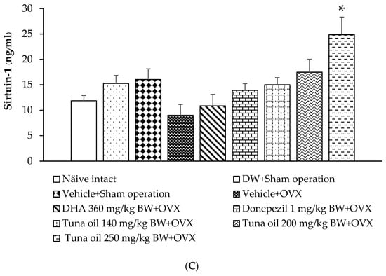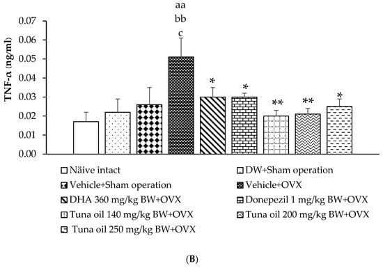 Figure 8A–C reveal that the sham operation procedure, DW, and the vehicle failed to show any significant changes in IL-6, TNF-α, and CRP in the serum of the experimental rats. However, OVX rats that received the vehicle showed a significantly increased IL-6 (p-value < 0.001, compared to the naïve control group; p-value < 0.001, compared to the DW + sham operation group; and p-value < 0.001, compared to the vehicle + sham operation group). However, this change was attenuated with DHA and all doses of tuna oil used in this study (p-values < 0.01, 0.05, 0.05, and 0.01, respectively, compared to the vehicle + OVX-treated group), as shown in Figure 8A. In addition, OVX increased TNF-α (p-value < 0.01, compared to the naïve control group; p-value < 0.01, compared to the DW + sham operation group; and p-value < 0.05, compared to the vehicle + sham operation group). The mentioned change was also mitigated with DHA, donepezil, and all doses of tuna oil (p-values < 0.05, 0.05, 0.01, 0.01, and 0.05, respectively, compared to the vehicle + OVX-treated group), as shown in Figure 8B. Figure 8C reveals that the level of CRP in the serum of OVX rats also increased (p-value < 0.05, compared to the DW + sham operation group). The medium dose of omega-3-rich tuna oil also improved this change.
