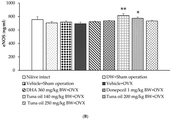 The effect of tuna oil on retention memory was also explored, and the results are shown in Figure 2B. Compared to naïve intact rats, no significant change in retention time was observed in the rats subjected to the sham operation or those administered DW or the vehicle. OVX rats that received the vehicle produced a significant reduction in retention time (p-value < 0.05, compared to the vehicle + sham operation-treated group). However, donepezil significantly increased the retention time of OVX rats (p-value < 0.05, compared to the vehicle + OVX-treated group) on day 7. No other significant changes were observed. Therefore, our results suggest that omega-3-rich tuna oil did not exert an effect on retention time.