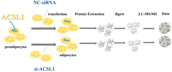 The bovine adipocytes prepared at −80 °C were transferred to 1.5 mL centrifuge tubes. The samples for testing were labeled as si_ACSL1_1, si_ACSL1_2, and si_ACSL1_3 (n = 3) and NC_ACSL1_1, NC_ACSL1_2, and NC_ACSL1_3 (n = 3), respectively. An appropriate amount of DB protein solution containing 8 M urea and 100 mM TEAB with pH = 8.5 was added and mixed by shaking. After ultrasonic treatment in an ice water bath for 5 min to completely disrupt the cells, the cells were centrifuged at 4 °C at 12,000× g for 15 min, and the supernatant was collected. Subsequently, the supernatant was supplemented with 10 mM DTT and incubated at 56 °C for 1 h, followed by sufficient IAM treatment at 25 °C for 1 h.