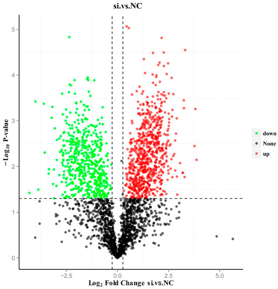 Figure 3. Volcano plot of DEP distribution in NC-treated group vs. si-treated group. The x-axis represents the difference fold (log2 value) of the differential proteins, the y-axis represents the p-value (−log10 value), black represents the proteins with no significant difference, red represents the upregulated proteins, and green represents the downregulated proteins.