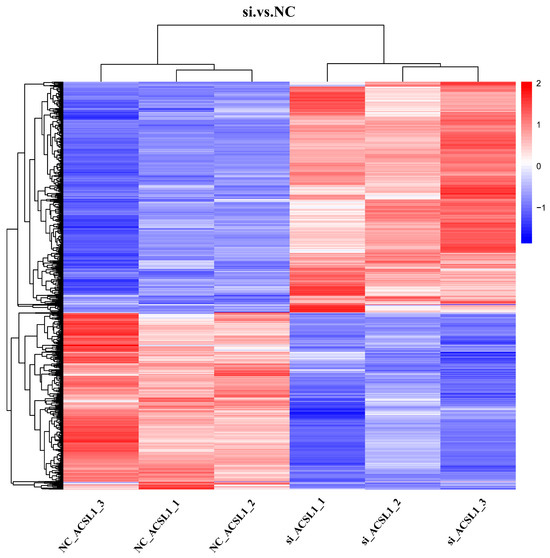 Figure 4. Heatmap of differential protein clustering of DEPs in NC-treated group vs. si-treated group. Red represents upregulation; blue represents downregulation; vertical is the clustering of samples; horizontal is the protein clustering; the shorter the clustering branches, the higher the similarity; the vertical clustering shows the expression pattern of the protein content between the sample clustering.