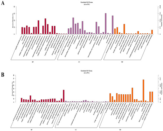 Figure 5. GO enrichment analysis of DEPs. (A) Top 50 GO entries significantly enriched by upregulated DEPs (including biological processes, cellular components, and molecular functions). (B) Top 50 GO entries significantly enriched by downregulated DEPs (including biological processes, cellular components, and molecular functions).
